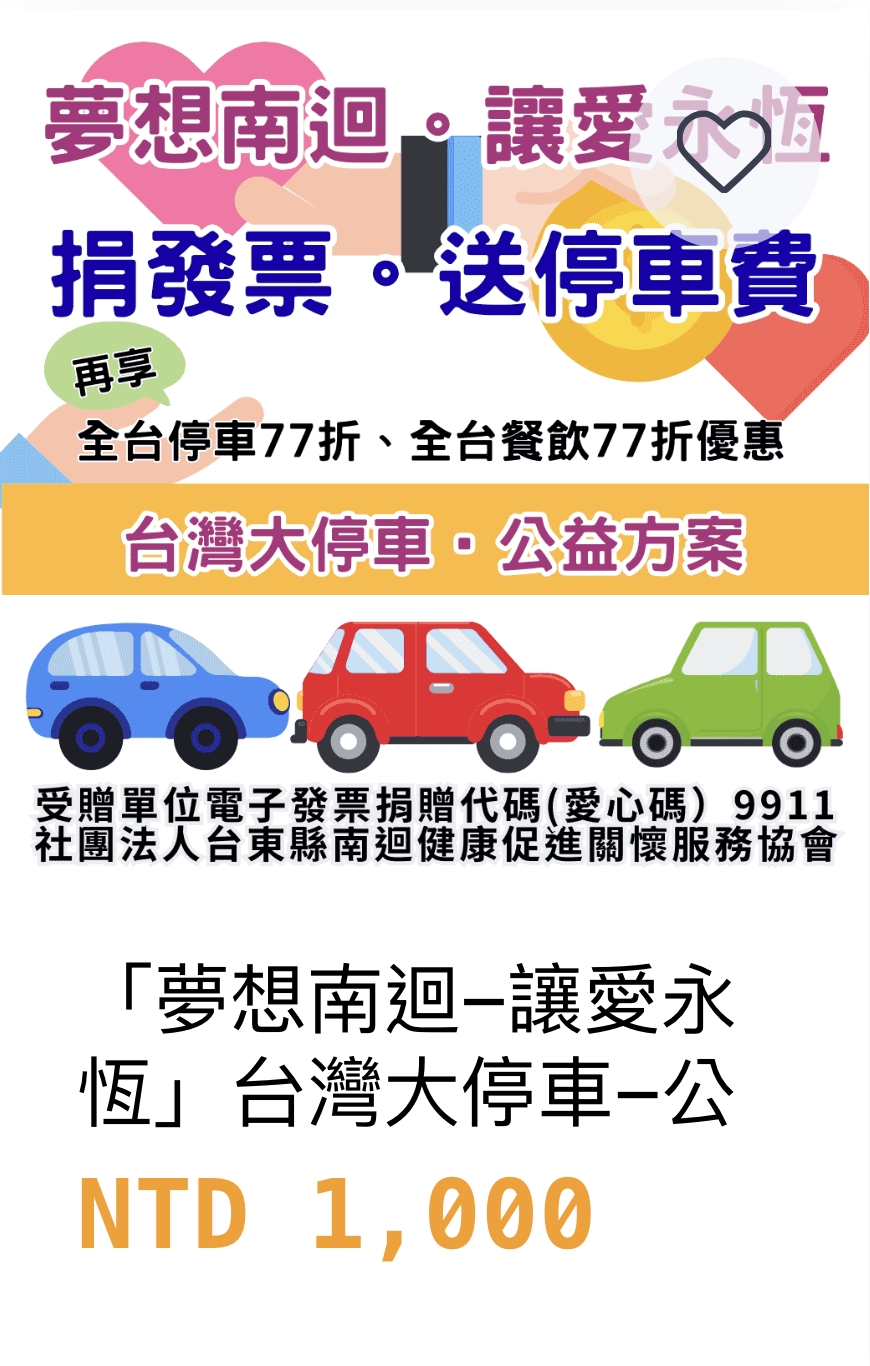 「夢想南迴。讓愛永恆」公益活動開跑囉!10/01起,訂閱發票將捐贈南迴協會。捐發票、訂閱台灣大停車1000元公益方案、即可獲得停車77折優惠,愛心不落人後!立即詢問「客服」或搜尋「公益」