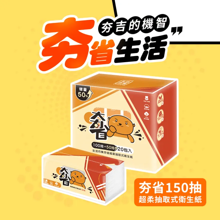 【生活市集】夯省超柔可溶水抽取式衛生紙(150抽/包) 【規格】品牌:生活市集尺寸:180mmx180mm抽數/長度/重量:150抽(±5%)層數:雙層產地:台灣材質/成份:100%原生紙漿總效期:五年包裝內容物:(150抽x20包x4串/箱)、(150抽x20包x1串/箱)是否可碎裂於水中:是