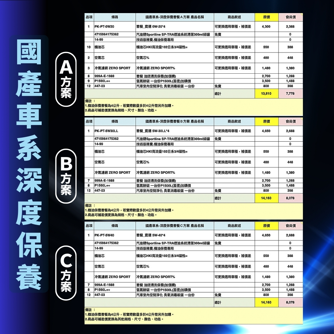 1.機油保養套餐為4公升,若實際數量多於4公升需另外加購。