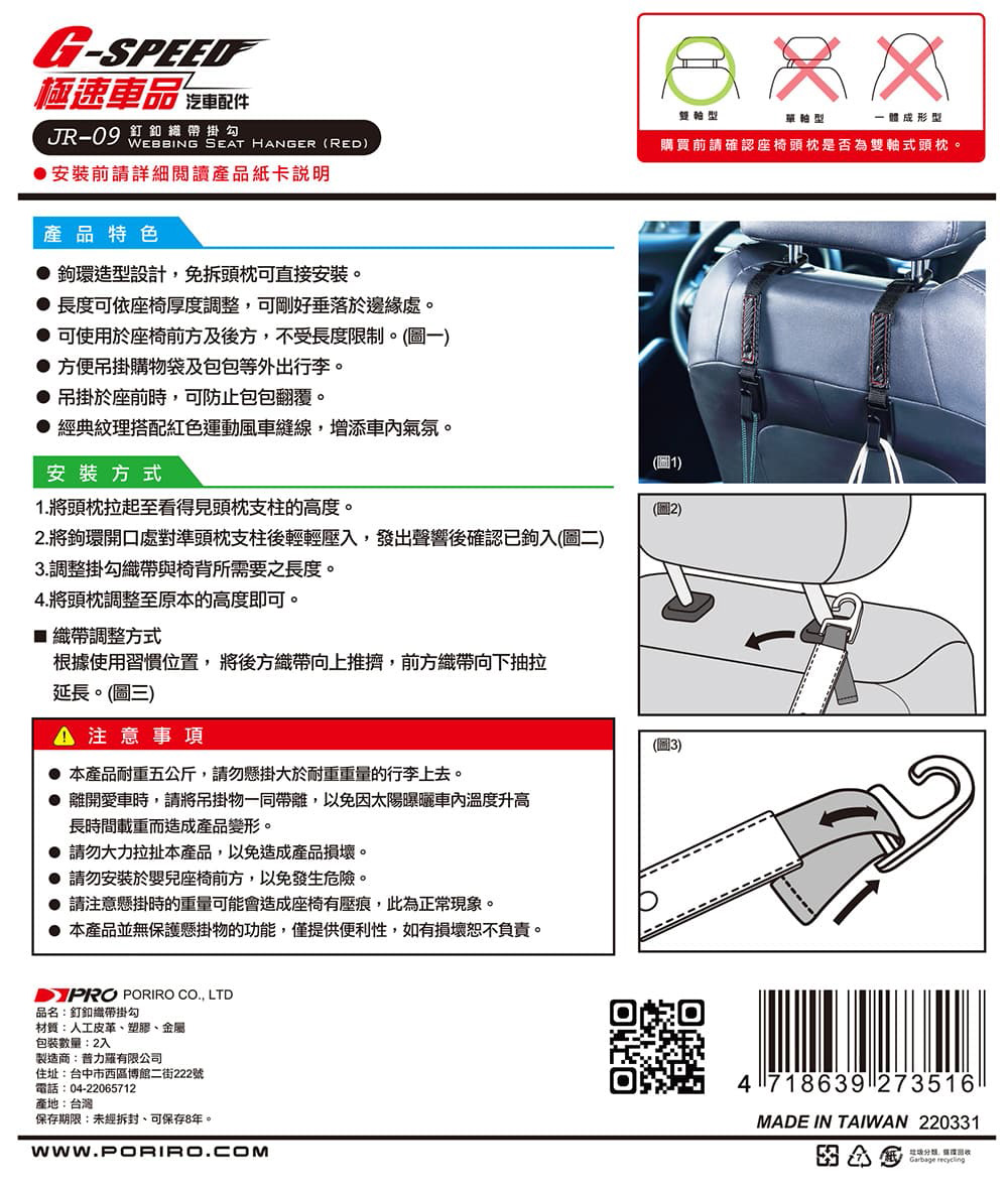 【車麗屋汽車百貨】掛勾 頭枕用 碳纖紋釘扣織帶 JR-09 G-SPEED
