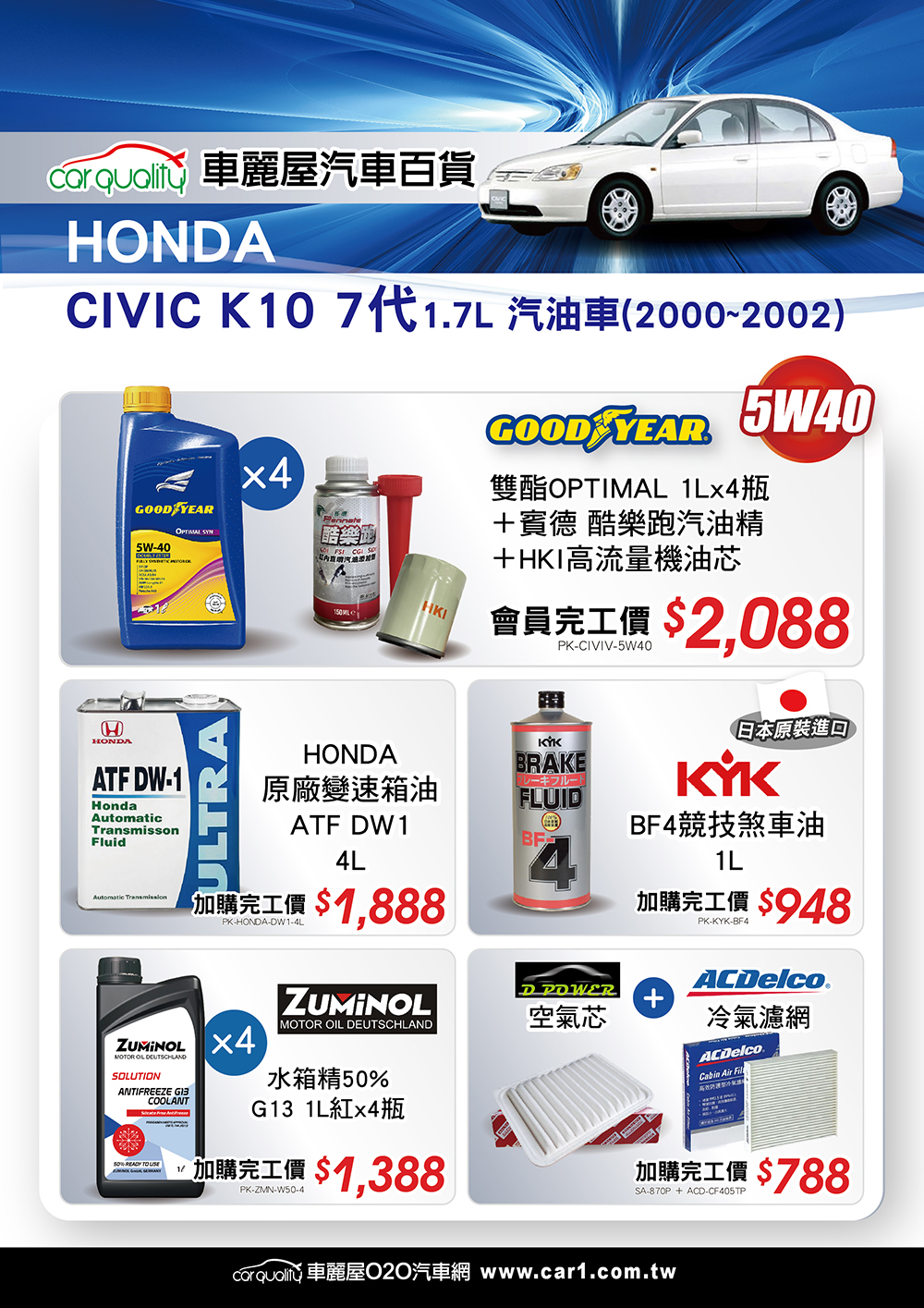 即將上架!HONDA【固特異 GOODYEAR】機油套餐 5W40 雙酯 OPTIMAL 1L*4 完工價(HONDA CIVIC 7代K10 FERIO 1.7L汽油車 2000-2002)(消費積點:1)